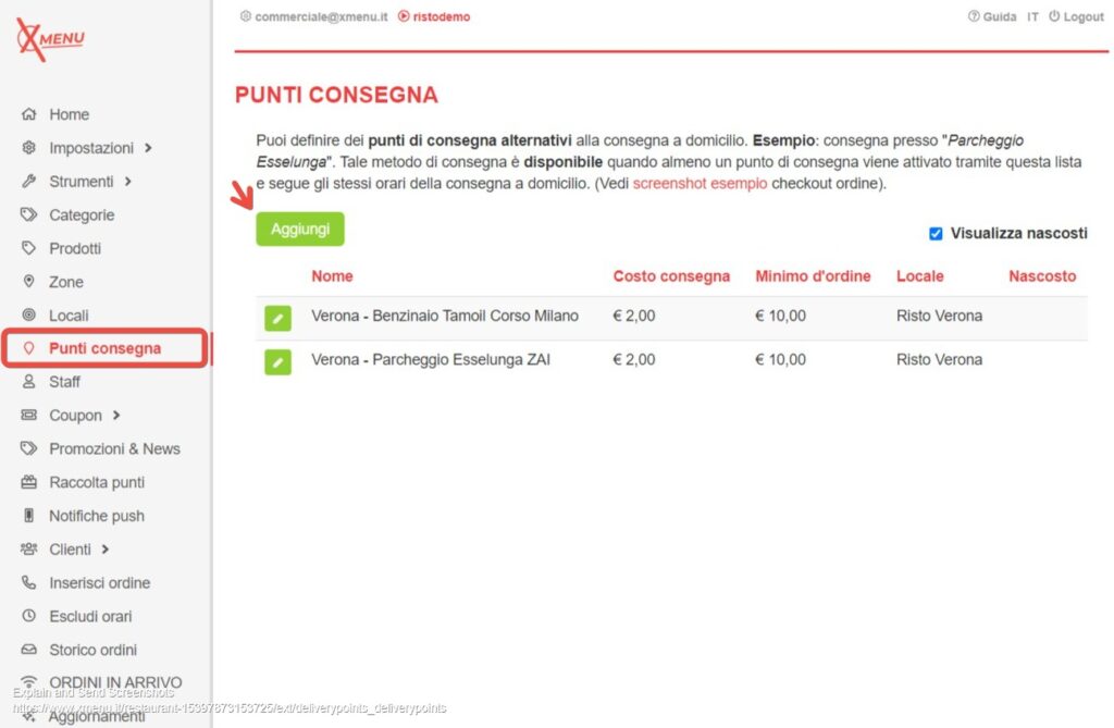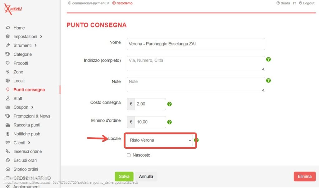 10 Giugno 20226 Giugno 2022 di xmenu PUNTI RITIRO E CONSEGNA Vorresti consegnare in un punto che è troppo lontano? Utilizza i punti di consegna! In questo modo crei un compromesso per consegnare anche ai clienti che sono fuori dal tuo raggio di consegna. Solitamente i punti di consegna classici sono luoghi conosciuti, ad esempio i parcheggi dei supermercati – centri commerciali. Come li vede il cliente? Come lo imposto in xMenu? Vai sul Pannello > Punti consegna > clicca su Aggiungi e compila i campi richiesti come nome, indirizzo, eventuali note, costo di consegna e minimo ordine. Non dimenticare di specificare a quale locale il punto di consegna si riferisce Infine salva se hai bisogno di aiuto contattaci supporto@xmenu.it FINE