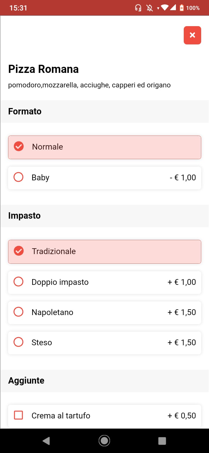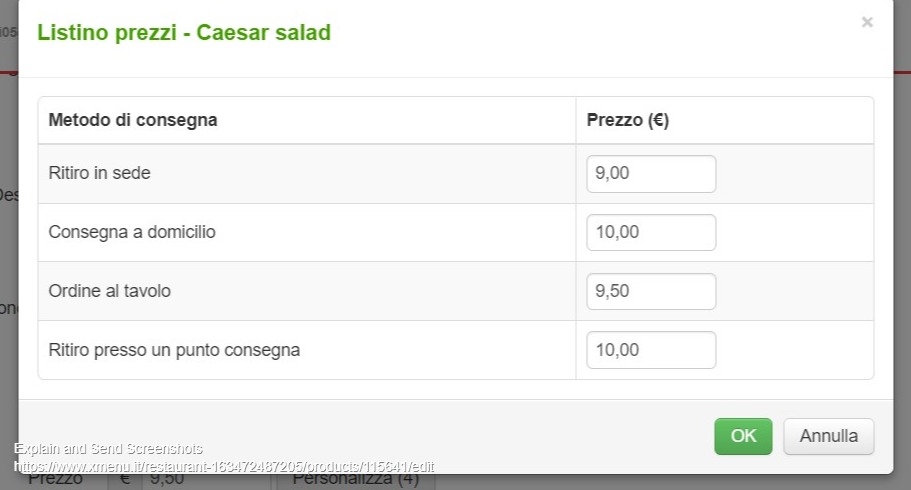 Puoi personalizzare il listino prezzi sia impostando prezzi diversi per ordini al tavolo, consegna a domicilio oppure ritiro in sede.