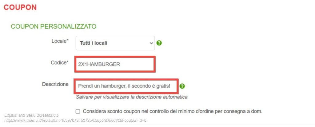 2. Vai in coupon> crea coupon> coupon personalizzato e imposta i seguenti campi: