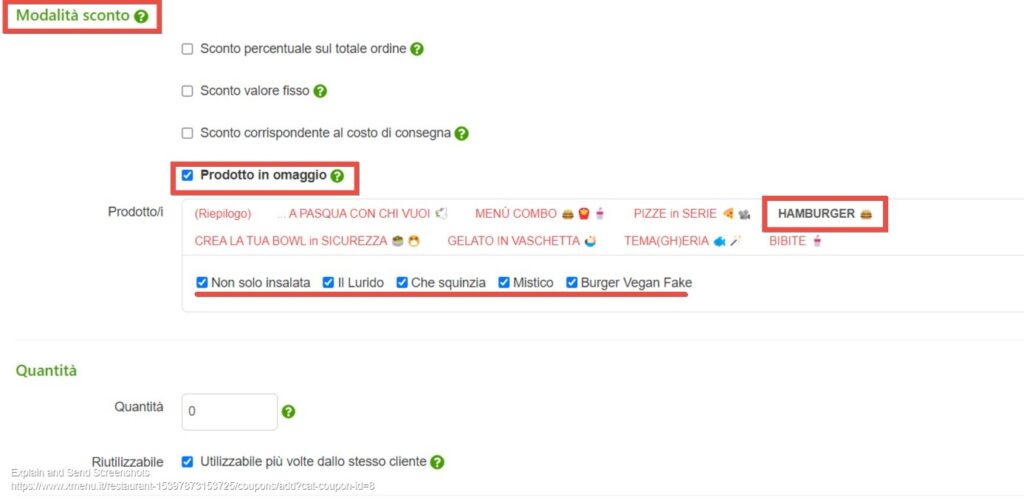 Esempio: se la promo 2×1 è sugli Hamburger devi avere inserito una categoria chiamata Hamburger con solo i prodotti fruibili nella promo.