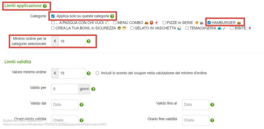 – Limiti applicazione –> applica solo su queste categorie e scegli la categoria in questione, in questo caso Hamburger